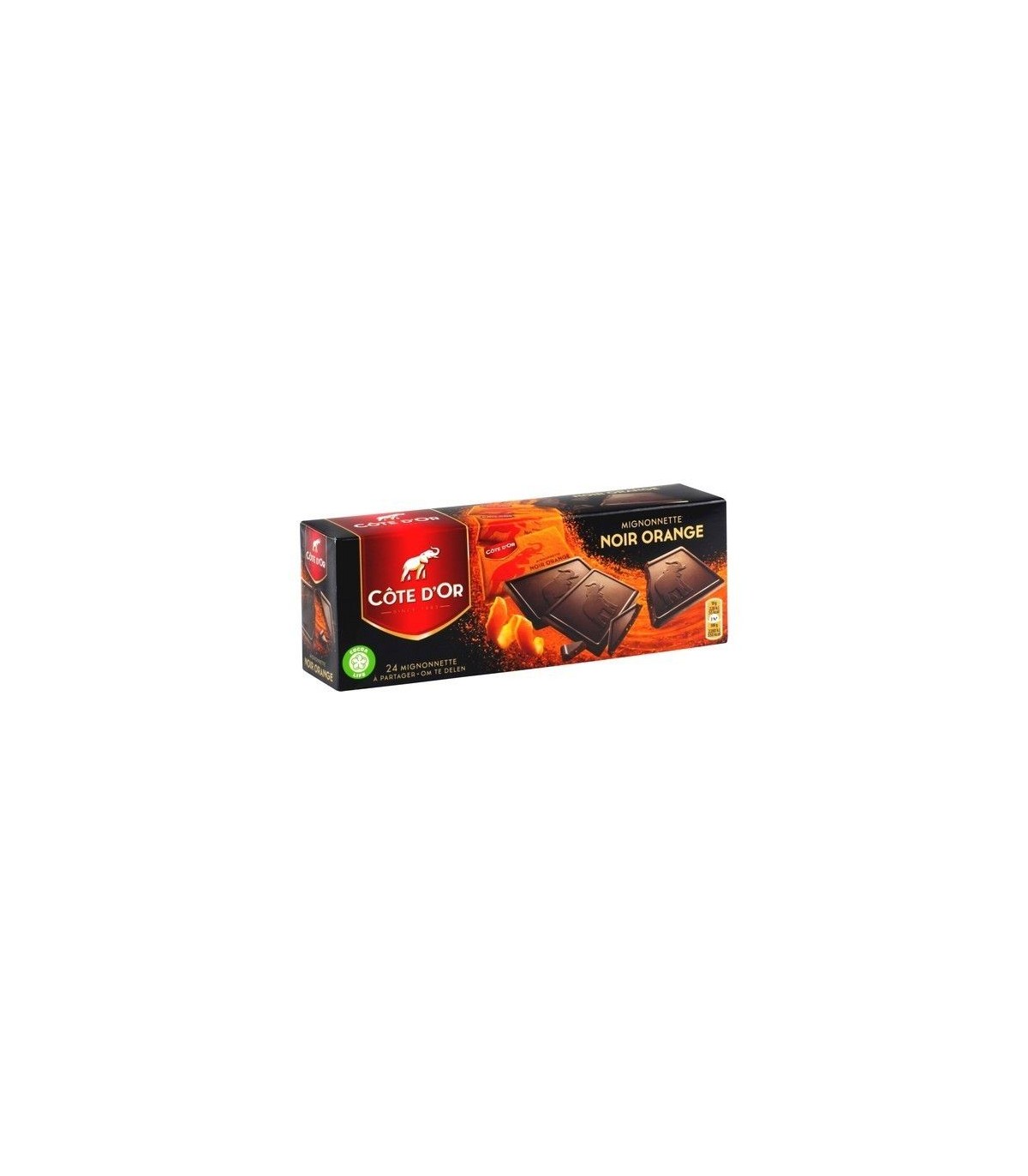 Côte d’Or vous propose 24 mignonnettes de chocolat noir aux zestes d’orange confite (2%). Une touche fruitée et gourmande dans 240 g de plaisir.