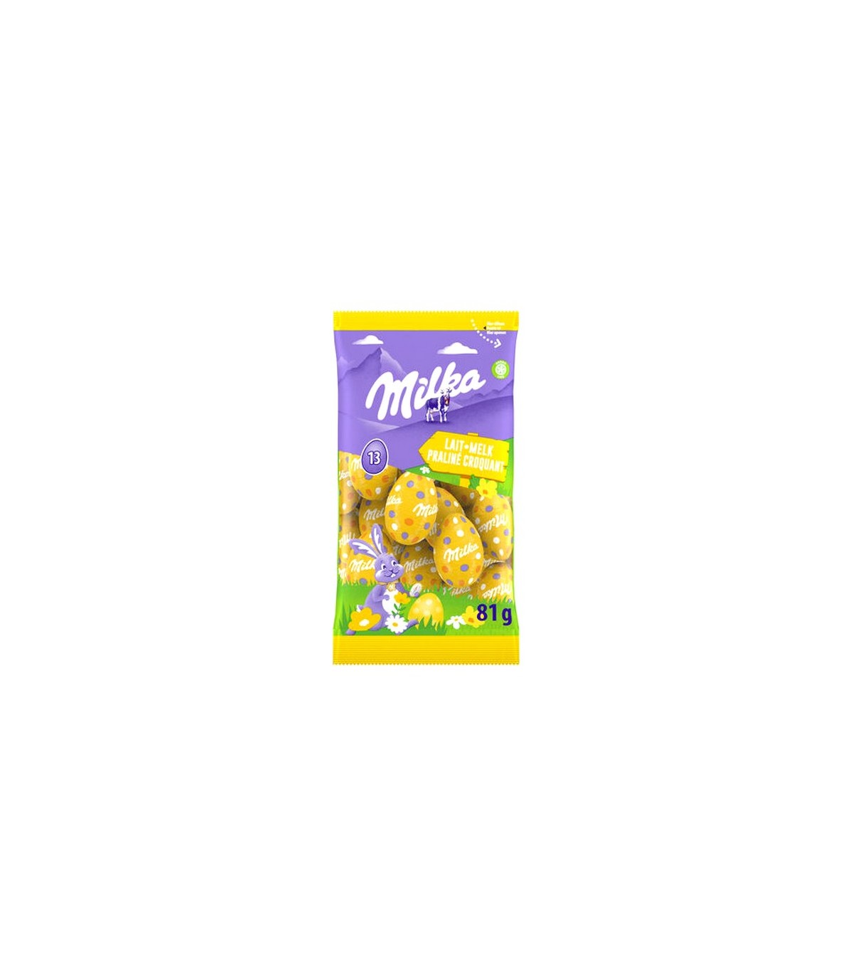 13 œufs de Pâques Milka en chocolat au lait fourrés d’un praliné croquant gourmand. Une alliance fondante et croustillante à partager. Sachet 81 g.